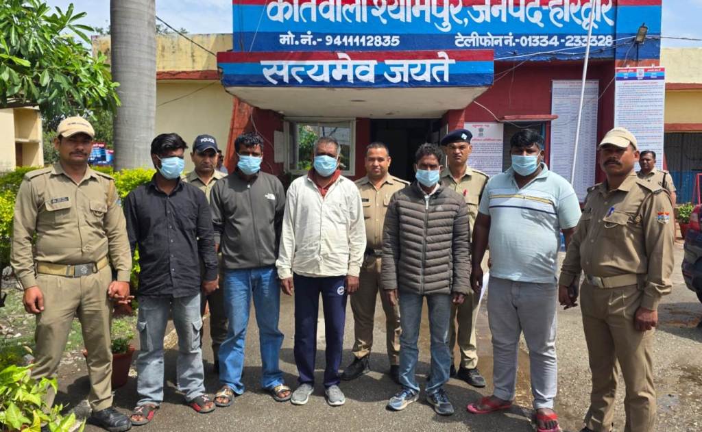 गिरफ्तार आरोपियों के नाम सुबोध पुत्र बेचनराम, निवासी खत्ताबस्ती चण्डीघाट,सन्दीप पुत्र स्व0 किशन, निवासी ग्राम कांगड़ी श्यामपुर, सोनू उर्फ टुंडा पुत्र सन्तोष शर्मा, निवासी दीनदयाल पार्किंग, रोड़ीबेलवाला, गोविन्द शाह पुत्र गणेश शाह उर्फ चित्रा, निवासी भीमगौड़ा खड़खड़ी, हाल निवासी गाजीवाली श्यामपुर, रामबाबू उर्फ भूरा पुत्र जोगेन्द्र, निवासी दीनदयाल पार्किंग, रोड़ीबेलवाला है। पुलिस टीम में थानाध्यक्ष नितेश शर्मा, उ0नि0 सन्तोष सेमवाल, प्रभारी चौकी चण्डीघाट, का0 अनिल रावत, का0 राजवीर सिंह शामिल रहे।