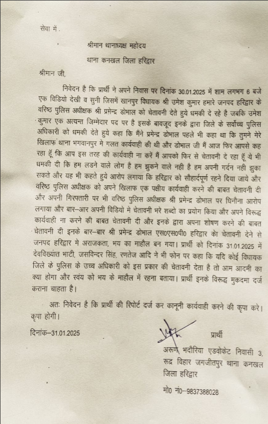 अधिवक्ता अरूण भदौरिया ने पुलिस को दी तहरीर में बताया कि खानपुर विधायक उमेश कुमार और पूर्व विधायक कुंवर प्रणव सिंह चैंपियन के मध्य विवाद में उमेश कुमार ने एसएसपी प्रमेंद्र डोबाल के खिलाफ एक वीडियो वायरल की है। जिसे अरुण भदौरिया एडवोकेट निवासी जगजीतपुर में अपने निवास स्थान पर 30 जनवरी 2025 में शाम 6:00 बजे देखना व सुनना बताया। वीडियो में खानपुर विधायक उमेश कुमार प्रमेंद्र डोबाल को चेतावनी देते हुए धमकी दे रहे हैं। जबकि उमेश कुमार एक अत्यंत जिम्मेदार पद पर हैं। जिले के सर्वोच्च पुलिस अधिकारी को धमकी देते हुए कहते हैं मैंने प्रमेंद्र डोबाल पहले भी कहा था तुमने मेरे खिलाफ भगवानपुर में गलत कार्रवाई की मैं आज फिर आपसे कह रहा हूं आप इस तरह की कार्रवाई न करें। आपको फिर से चेतावनी दे रहा हूं। यह भी धमकी दी कि हम लड़ने वाले लोग हैं, झुकने वाले नहीं हैं। हम अपनी गर्दन नहीं झुका सकते और यह भी एक आरोप लगाया कि हरिद्वार को सौहार्दपूर्ण रहने दिया जाए। यहां तक एसएसपी प्रमेंद्र डोबाल के खिलाफ एक पक्षीय कार्रवाई करने की बाबत फिर चेतावनी दी और अपने गिरफ्तारी पर भी प्रमेंद्र डोबाल पर घिनौना आरोप लगाया। बार-बार अपने वीडियो में चेतावनी भरे भड़काऊ शब्दों का प्रयोग किया है। अपने विरुद्ध कार्रवाई न करने की बाबत चेतावनी दी। अपना शोषण होने की भी चेतावनी दी। जिस कारण बार-बार जिले के वरिष्ठ पुलिस अधिकारी को चेतावनी देने से जनपद में अराजकता व भय का माहौल बनना बताया।