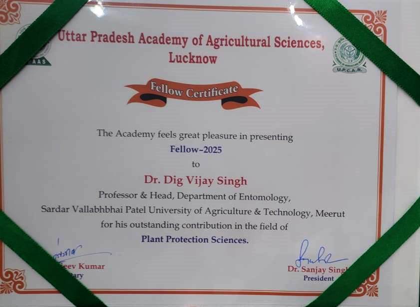 सरदार वल्लभभाई पटेल कृषि एवं प्रौद्योगिकी विश्वविद्यालय के कृषि महाविद्यालय में कीट विज्ञान विभाग के प्रोफेसर एवं विभागाध्यक्ष डॉ. डीवी सिंह को उनके उत्कृष्ट योगदान के लिए प्लांट प्रोटेक्शन साइंसेज का फेलो अवॉर्ड प्रदान किया गया है।