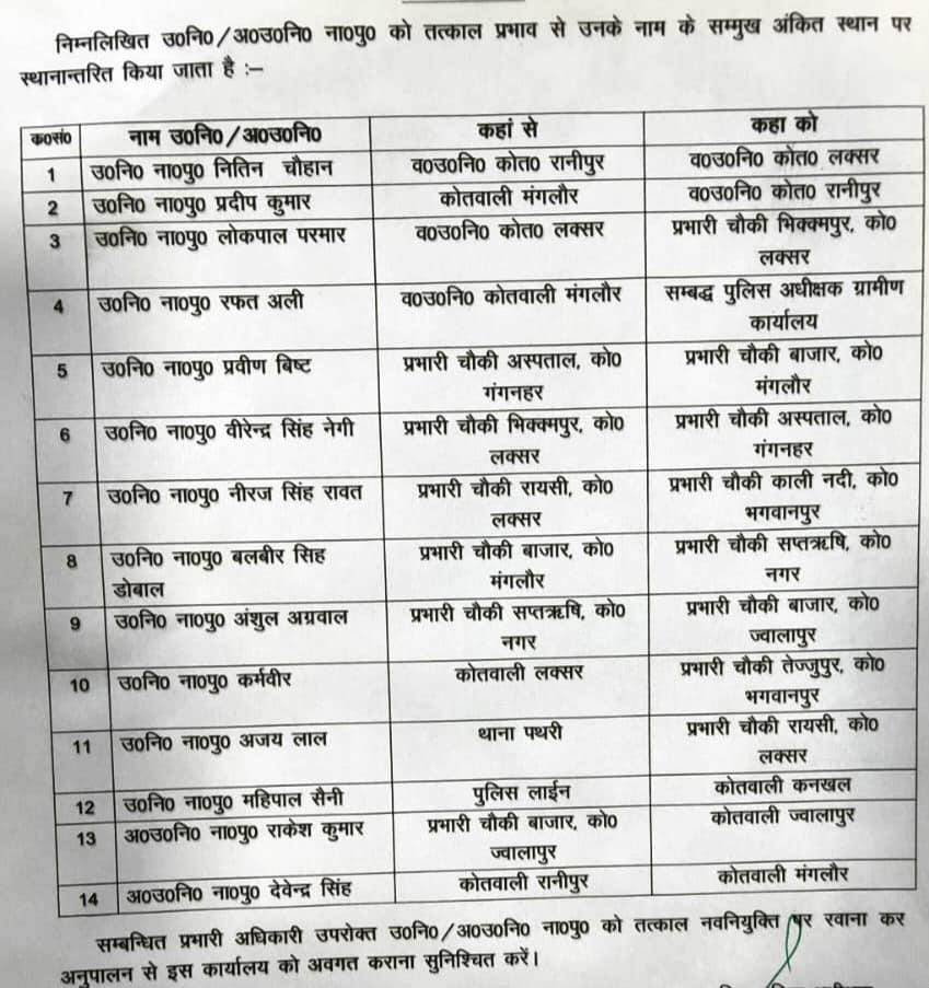 रानीपुर कोतवाली के एसएसआई नितिन चौहान को लक्सर कोतवाली का एसएसआई बनाया गया है, कोतवाली मंगलौर से प्रदीप कुमार को रानीपुर कोतवाली का एसएसआई बनाया गया है। एसएसआई लक्सर के लोकपाल परमार को भिक्कमपुर चौकी प्रभारी बनाया गया है।