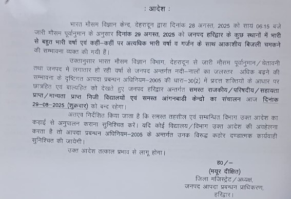 देर रात से हो रही भारी बारिश के चलते जिलाधिकारी ने अतिवृष्टि के दृष्टिगत सभी स्कूलों में आज शुक्रवार को अवकाश घोषित कर दिया। आज सभी स्कूल और आंगनवाड़ी केंद्र बंद रहेंगे। यदि ऑनलाइन क्लास संचालित करनी है तो करा सकतें है।