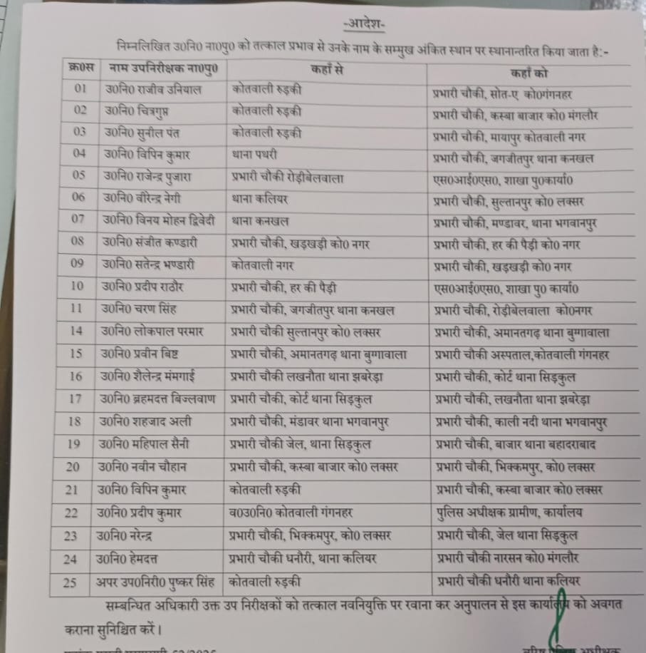 Transfer: कप्तान प्रमेंद्र डोबाल ने चलायी तबादला एक्सप्रेस, हरकी पैडी चौकी की कमान संजीत को