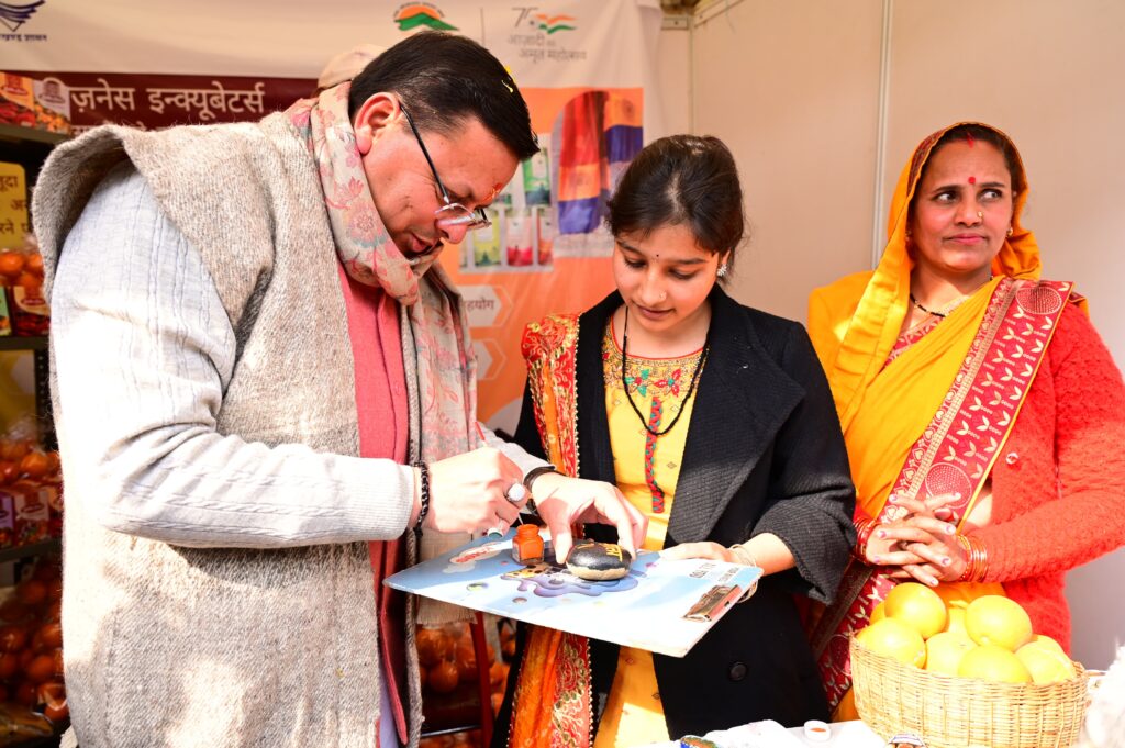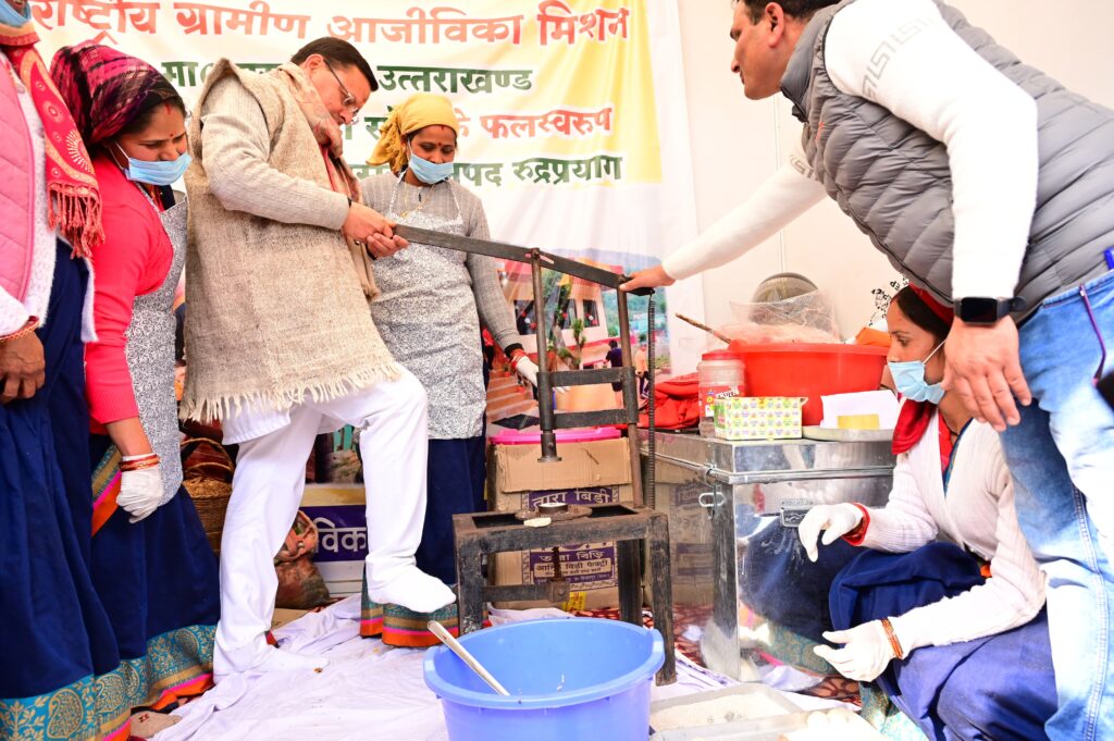 रूरल बिजनेस इंक्यूबेटर की ओर से लगे स्टॉल पर शिल्पकार के उद्यमियों एवं स्वास्तिक स्वयं सहायता की महिलाओं के साथ मिलकर मुख्यमंत्री धामी ने स्टोन पेन्टिंग करते हुए उनकी संस्था की जानकारी ली। वहीं उन्नती क्लस्टर संगठन, कालीमठ कोटमा की महिलाओं के स्टॉल पर कताई एवं बुनाई की। संगठन की अध्यक्ष सरिता देवी ने उन्हें हाथकरघा की पूरी विधि बताते हुए अपने संगठन की जानकारी दी। उन्होंने समूह के उत्पादों की सराहना करते हुए श्री केदारनाथ धाम एवं यात्रा मार्ग पर भी आउटलेट खोलने एवं पारंपरिक तरीके से बन रहे दोखे, शौल, टोपी आदि का खूब प्रचार करने को कहा।