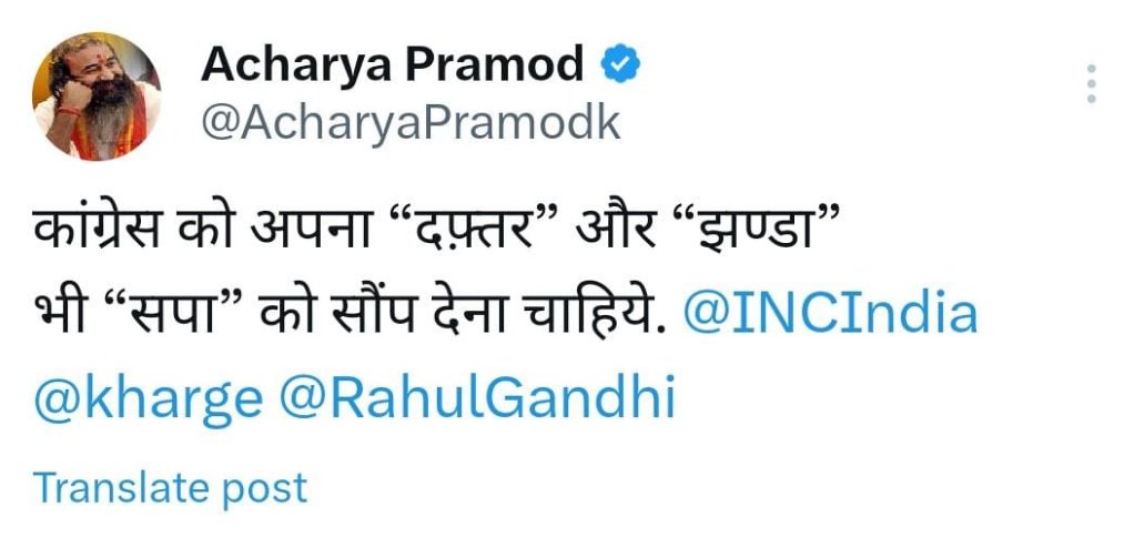 उत्तर प्रदेश के उपचुनावों में सपा और कांग्रेस के बीच हुए गठबंधन के बावजूद कांग्रेस का किसी भी सीट पर चुनाव न लड़ने के फैसले पर आचार्य प्रमोद कृष्णम ने कांग्रेस पर तंज कसा है। उन्होंने सोशल मीडिया पर अपनी पोस्ट में लिखा कि कांग्रेस को अपनी पार्टी का झंडा और दफ्तर सपा को सौंप देना चाहिए।