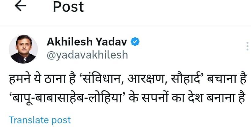 वहीं दूसरी ओर यूपी के उपचुनाव में कांग्रेस के नहीं लड़ने के ऐलान के बाद अखिलेश यादव ने आज सुबह एक तस्वीर जारी की है। जिसमें वह आरक्षण संविधान और सौहार्द बचाने की बात कर रहे हैं।