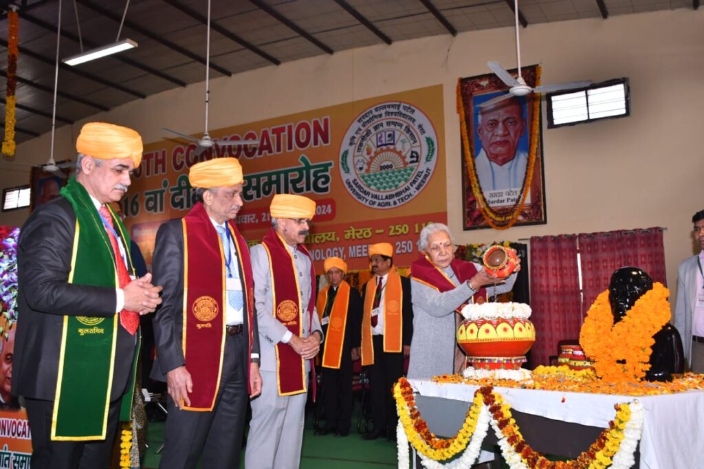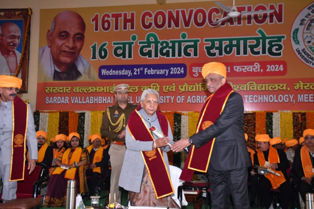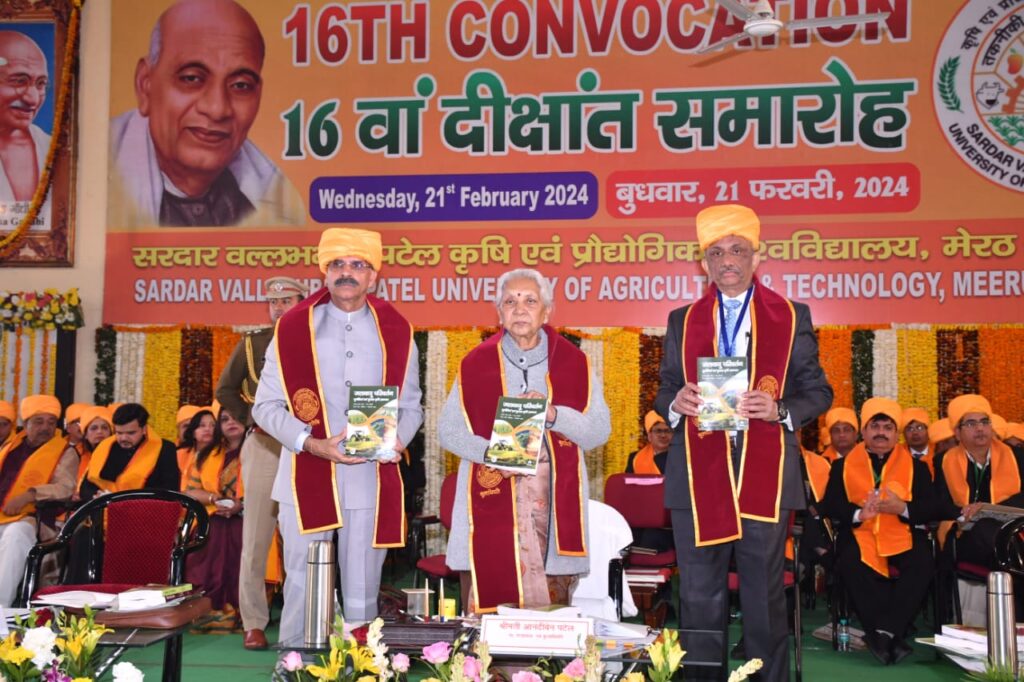 मेरठ। सरदार वल्लभभाई पटेल कृषि एवं प्रौद्योगिकी विश्वविद्यालय का 16वां दीक्षांत समारोह महामहिम राज्यपाल आनंदी बेन पटेल की अध्यक्षता में भव्य रूप से आयोजित किया गया। इस अवसर पर उत्कृष्ट प्रदर्शन के लिए 18 पदक व स्नातक, स्नातकोत्तर, पीएचडी में छात्र-छात्राओ को कुल 519 उपाधियां प्रदान की गई। कार्यक्रम का शुभारंभ सरदार वल्लभ भाई पटेल की र्प्रतिमा पर माल्यार्पण व मटकी में जलधारा अर्पित कर जल संचयन के संदेश के साथ तथा पुस्तकों का विमोचन कर किया गया। ड्रोन पॉयलेट ट्रेनिंग कम रिसर्च एंड डेवलेपमेंट सेंटर का अनावरण किया गया। राज्यपाल ने प्राथमिक विद्यालय के बच्चों को उपहार तथा शिक्षिकाओं को पुस्तकें भेंट की।