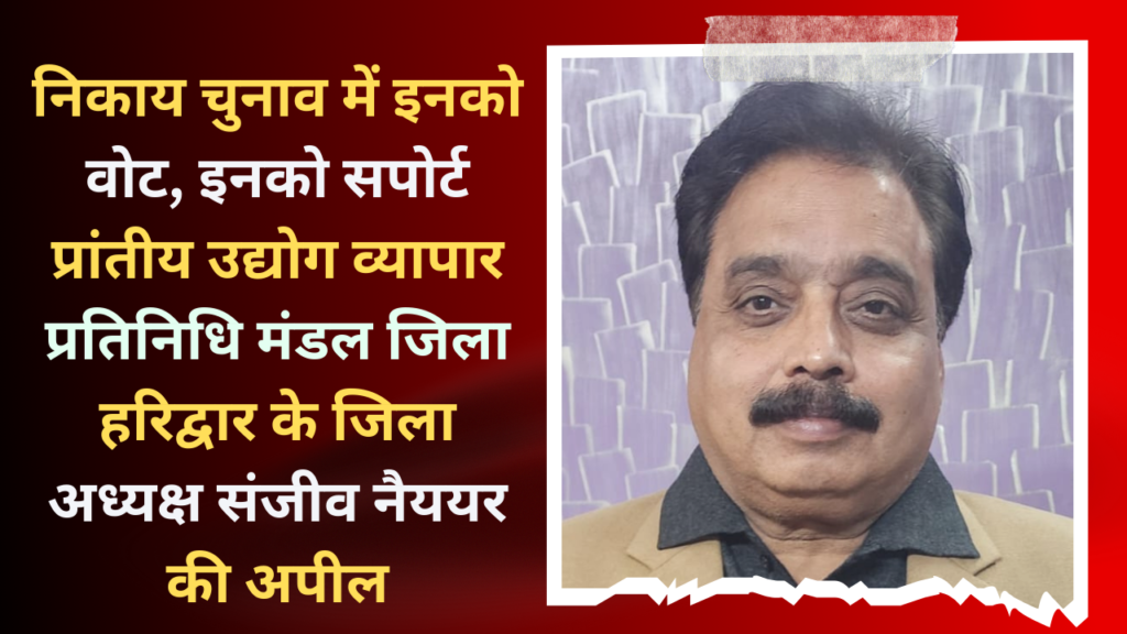 सभी व्यापारी भाइयों को मेरा हाथ जोड़कर नमस्कार: जैसा कि आप लोगों को ज्ञात है नगर निगम के चुनाव प्रस्तावित हो गए हैं। मेरा आपसे निवेदन है कि अपने आस पड़ोस में जो भी व्यापारी नेता चुनाव लड़ रहा है या व्यापारी भाई चुनाव लड़ रहा है। अपना अमूल्य वोट इस व्यापारी भाई को दें। जो कि आगे जाकर नगर निगम के सदन में व्यापारियों की आवाज को उठाने का काम करेगा। आश्वासन पर ना जाएं। विश्वास करें अगर आपको उस उम्मीदवार पर विश्वास है तो इस व्यापारी नेता को अपना अमूल्य वोट दें। जो की हरिद्वार में व्यापारियों के लिए आने वाली समस्याओं को नगर निगम के सदन में जोरदार तरीके से उठा सके।