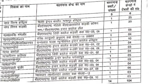 नगर निगम हरिद्वार में डाले गए मतों की गणना के लिए मतगणना स्थल पर 25 टेबल लगायी जाएंगी। मतगणना का कार्य भल्ला इंटर कॉलेज में होगी। नगर निगम हरिद्वार में 60 वार्ड है। ऐसे में माना जा रहा है कि मतगणना की गिनती का कार्य देर रात तक चलेगा। देर रात तक मतगणना कार्य चलने की संभावना के चलते दूसरी शिफ्ट के मतगणना कार्मिकों को भी ड्यूटी के लिए तैयार रखा गया है।