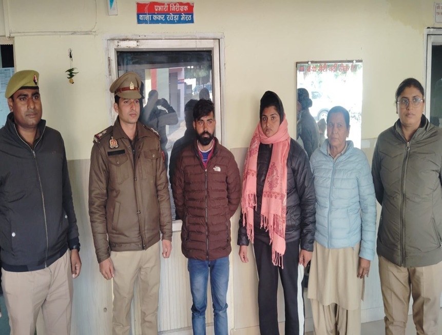 जनपद मेरठ की थाना कंकरखेड़ा पुलिस के मुताबिक गिरफ्तार अभियुक्त प्रवेश उर्फ छोटू पुत्र महक सिंह निवासी श्रद्धापुरी थाना कंकरखेडा और श्रद्धापुरी निवासी महिला को डिवाइडर रोड तिराहा से गिरफ्तार किया गया है। पुलिस के मुताबिक दिनांक 16.12.2025 को वादी विपिन कुमार पुत्र साहब सिंह निवासी नारायण गार्डन रोहटा रोड थाना कंकरखेड़ा, मेरठ के द्वारा सूचना अंकित करायी गई थी कि अभियुक्तगणों द्वारा फोन करवाकर वादी व उसके परिवार को जान से मारने की धमकी दी गई तथा इसके एवज में एक करोड़ रुपये की मांग की गयी। सूचना पर थाना कंकरखेडा पर मु0अ0सं0- 762/2025 धारा 308(5), 351(3),352,127(2) बीएनएस पंजीकृत कर अभियुक्तगणों को गिरफ्तार किया गया है।