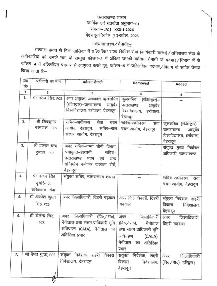 उत्तराखण्ड शासन ने प्रशासनिक व्यवस्था को और अधिक सुदृढ़ बनाने के उद्देश्य से शुक्रवार को बड़ा फेरबदल करते हुए प्रांतीय सिविल सेवा (पीसीएस) एवं सचिवालय सेवा के अधिकारियों के व्यापक तबादले और नई तैनातियों के आदेश जारी किए हैं। कार्मिक एवं सतर्कता अनुभाग-01 द्वारा जारी आदेश के अनुसार, कुल 26 अधिकारियों को तत्काल प्रभाव से उनके वर्तमान पदभार से अवमुक्त करते हुए नई जिम्मेदारियां सौंपी गई हैं।इस प्रशासनिक बदलाव में कई अहम पदों पर नई नियुक्तियां की गई हैं, जिससे शासन की कार्यप्रणाली में तेजी और प्रभावशीलता लाने का संकेत मिलता है।