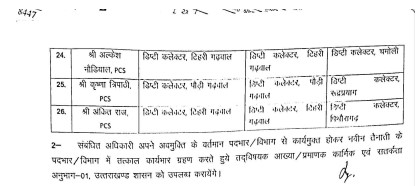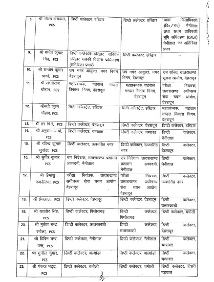 वैभव गुप्ता को हरिद्वार का अपर जिलाधिकारी (वि./रा.) बनाया गया है। सौरभ अरावाल को नैनीताल में अपर जिलाधिकारी (वि./रा.) एवं CALA का अतिरिक्त प्रभार दिया गया है। मनीष कुमार सिंह को हरिद्वार में डिप्टी कलेक्टर पद पर बनाए रखा गया है। संतोष कुमार पाण्डे को उत्तराखण्ड सूचना आयोग में उप सचिव बनाया गया। लक्ष्मीराज चौहान को अधीनस्थ सेवा चयन आयोग में परीक्षा नियंत्रक की जिम्मेदारी मिली। कुश्म चौहान को गढ़वाल मंडल विकास निगम का महाप्रबंधक नियुक्त किया गया।हर गिरि को देहरादून से हरिद्वार डिप्टी कलेक्टर के रूप में स्थानांतरित किया गया। शासन ने कई जिलों में डिप्टी कलेक्टर स्तर पर भी व्यापक बदलाव किए हैं। अनुराग आर्या (चम्पावत से नैनीताल), रविन्द्र जुवांठा (ऊधमसिंह नगर से देहरादून), हिमांशु कफल्टिया (देहरादून से ऊधमसिंह नगर), यशवीर सिंह (पिथौरागढ़ से चमोली), पंकज भट्ट (चमोली से टिहरी), अधिन्त राज (टिहरी से पिथौरागढ़) सहित कई अन्य अधिकारियों को नई तैनाती दी गई है।?