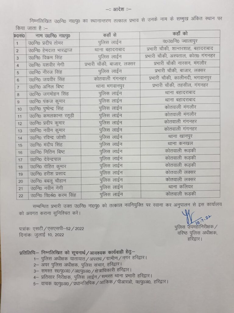डीआईजी व वरिष्ठ पुलिस अधीक्षक योगेंद्र सिंह रावत ने 22 उप निरीक्षकों के कार्यक्षेत्रों में बदलाव किया है। ज्वालापुर कोतवाली के वरिष्ठ उप निरीक्षक की जिम्मेदारी प्रदीप तोमर को दी गई है। उप निरीक्षक हेमदत्त भारद्वाज को प्रभारी चौकी शांतरशाह बहादराबाद, उपनिरीक्षक विक्रम सिंह को प्रभारी चौकी अस्पताल कोतवाली गंग नहर, यशवीर नेगी को प्रभारी चौकी नारसन, नीरज सिंह को प्रभारी चौकी बाजार लक्सर, जयवीर सिंह को प्रभारी चौकी काली नदी,अनिल बिष्ट को प्रभारी चौकी तहसील गंग नहर जबकि जगमोहन सिंह को थाना बहादराबाद, पंकज कुमार को थाना बहादराबाद, नवीन कुमार को कोतवाली गंगनहर रविंद्र जोशी को थाना श्यामपुर संदीप सिंह को थाना कनखल नितिन बिष्ट को कोतवाली रुड़की देवेंद्र पाल को कोतवाली रुड़की, पुष्पेंद्र सिंह को कोतवाली मंगलौर, कमलकांत रतूड़ी को कोतवाली मंगलौर, प्रदीप कुमार को कोतवाली गंगनहर नवीन कुमार को कोतवाली गंगनहर, रविंद्र जोशी को थाना खानपुर.