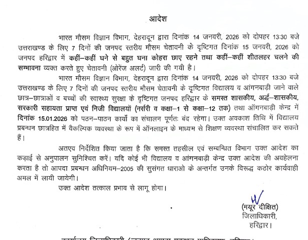 छात्र-छात्राओं की स्वास्थ्य सुरक्षा को प्राथमिकता देते हुए जिला प्रशासन ने आदेश जारी कर जनपद हरिद्वार के समस्त निजी विद्यालयों (नर्सरी से कक्षा 12 तक) एवं आंगनबाड़ी केंद्रों में 15 जनवरी 2026 का अवकाश घोषित किया है। आदेश में स्पष्ट किया गया है कि उक्त अवकाश अवधि के दौरान विद्यालय प्रबंधन छात्रहित में वैकल्पिक व्यवस्था के रूप में ऑनलाइन माध्यम से शिक्षण कार्य संचालित कर सकते हैं। हालांकि किसी भी स्थिति में विद्यालय परिसरों में भौतिक रूप से शिक्षण कार्य नहीं किया जाएगा।