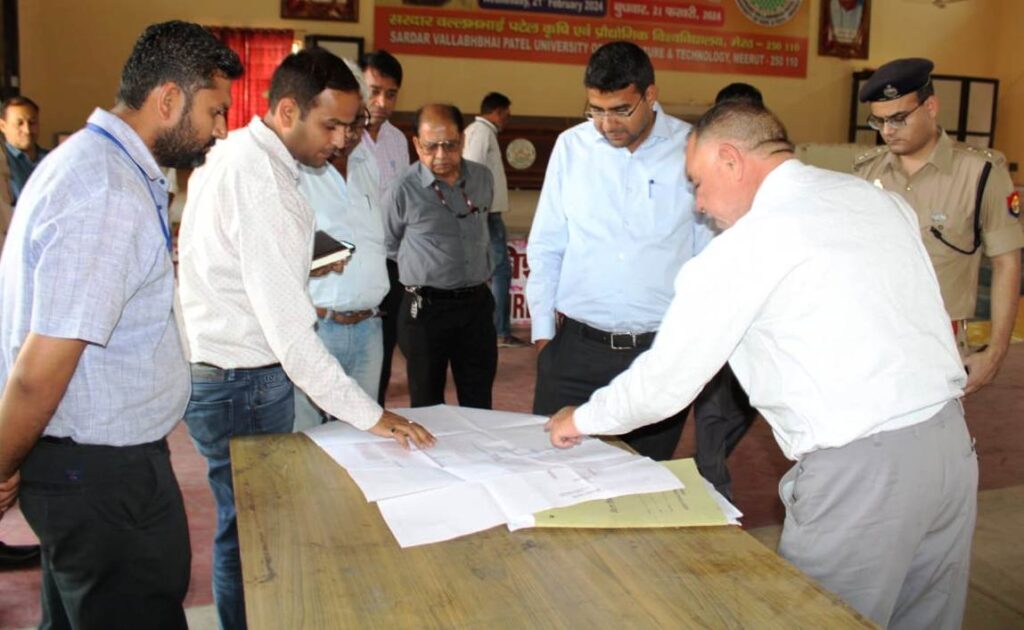 मेरठ। जिलाधिकारी दीपक मीणा द्वारा मतगणना केन्द्र सरदार वल्लभ भाई पटेल कृषि एवं प्रौद्योगिकी विश्वविद्यालय में मतगणना के लिए की जा रही तैयारियो के संबंध में संबंधित अधिकारियों के साथ निरीक्षण किया।