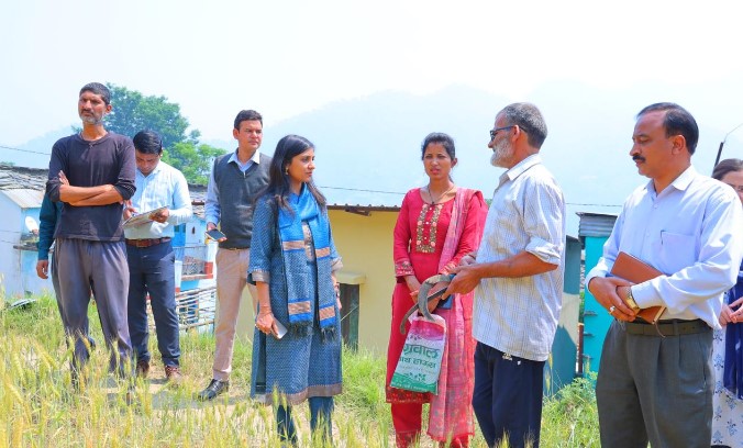 जिलाधिकारी स्वाति एस. भदौरिया ने तहसील पौड़ी के अंतर्गत राजस्व ग्राम डोभाल ढांढरी का भ्रमण कर क्रॉप कटिंग प्रयोग का स्थलीय निरीक्षण किया। इस दौरान राजस्व विभाग की टीम द्वारा कृषक कुलदीप सिंह के खेत में मानक के अनुसार 30 वर्ग मीटर का प्लॉट बनाकर ‘सीसीई एग्री ऐप’ के माध्यम से वैज्ञानिक पद्धति से प्रयोग संपन्न किया गया, जिसके परिणाम स्वरूप 10.86 किलोग्राम गेहूं की उपज प्राप्त हुई।