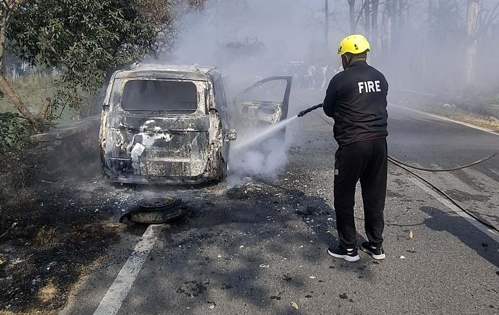 चलती गाड़ी में लगी आग, चालक की सूझबूझ से बची 6 जान