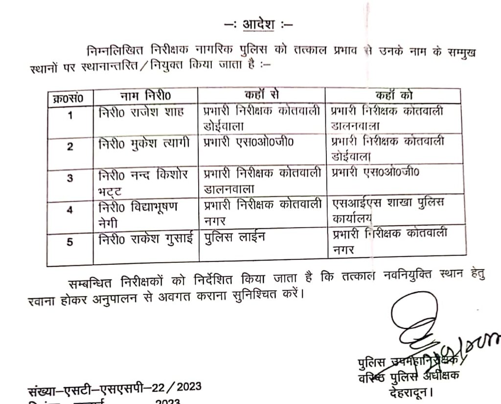 उत्तराखंड पुलिस के पांच इंस्पेक्टरों के तबादले किए गए हैं. निरीक्षक राजेश शाह को कोतवाली प्रभारी निरीक्षक डालनवाला बनाया गया है. निरीक्षक मुकेश त्यागी को कोतवाली डोईवाला, निरीक्षक नंदकिशोर भट्ट को प्रभारी एसओजी. निरीक्षक विद्या भूषण नेगी को एसएसआई शाखा पुलिस कार्यालय. निरीक्षक राकेश गुसाईं को कोतवाली प्रभारी निरीक्षक देहरादून की जिम्मेदारी दी है. एसएसपी/ डीआईजी दिलीप सिंह कुंवर ने जनपद की कानून व्यवस्था को बेहतर बनाने के लिए निरीक्षकों के कार्य क्षेत्र में बदलाव किया है।
