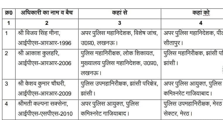 शासन ने चार आईपीएस अफसरों के तबादले किये हैं। यूपी में जिन चार आईपीएस अफसरों के तबादले किये गए हैं उनमें कल्पना सक्सेना को DIG पीएसी सेक्टर मेरठ बनाया गया है। केशव कुमार अपर पुलिस आयुक्त पुलिस कमिश्नरेट गाजियाबाद बनाकर भेजे गए हैं। आकाश कुलहरी डीआईजी रेंज झांसी और विजय सिंह मीणा को एडीजी पीटीसी सीतापुर की जिम्मेदारी दी गई है।