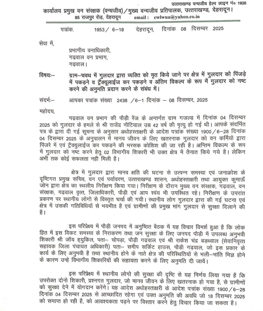 गढ़वाल वन प्रभाग के अंतर्गत पौड़ी रेंज क्षेत्र के ग्राम गजल्ड में गुलदार के हमले में 42 वर्षीय राजेंद्र नौटियाल की मौत के बाद वन विभाग ने मानव सुरक्षा को सर्वोपरि मानते हुए गुलदार को पकड़ने के लिए कड़े कदम उठाए हैं। प्रमुख वन संरक्षक (वन्यजीव) एवं मुख्य वन्यजीव प्रतिपालक, उत्तराखंड ने प्रभागीय वनाधिकारी, गढ़वाल वन प्रभाग को पत्र जारी कर गुलदार को पिंजरे में पकड़ने, ट्रैंक्विलाइज कर नियंत्रित करने तथा अंतिम विकल्प के रूप में उसे नष्ट करने की अनुमति प्रदान की गई है।