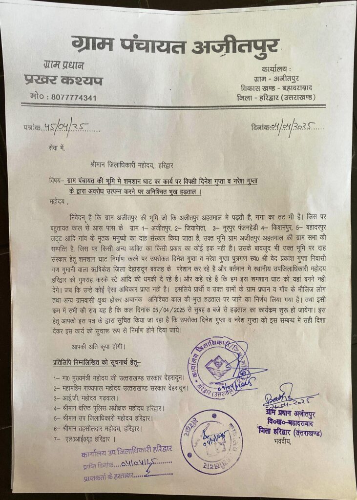 हरिद्वार तहसील के गांव अजीतपुर समेत आधा दर्जन गांवों के प्रधानों ने शनिवार से गांव के पंचायती भवन में भूख हड़ताल पर बैठने का निर्णय लिया है। इनका कहना है कि ग्राम पंचायत की भूमि पर शमशान घाट का कार्य रोकने का कार्य दिनेश गुप्ता और नरेश गुप्ता द्वारा किया जा रहा है। जबकि जिस स्थान पर शमशान घाट का निर्माण कराया जा रहा है वहां पर अजीतपुर, जियापोता, नूरपुर पंजनहेडी, किशनपुर, बहादरपुर जट समेत कई गांवों के मृतकों का अंतिम संस्कार किया जाता है। इस संबंध में ग्राम प्रधान अजीतपुर ने जिलाधिकारी काार्यलय में भी अपना ज्ञापन प्रेषित किया है।