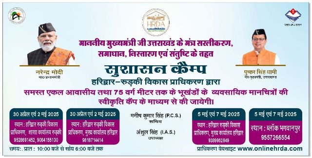 हरिद्वार रूड़की विकास प्राधिकरण हरिद्वार की जनता को मानचित्र स्वीकृत कराने के लिए सुशासन कैंप का आयोजन कर रहा है। जिसके लिए बाकायदा तिथियां और समय सारणी जारी की गई है। प्राधिकरण के उपाध्यक्ष अंशुल सिंह मुख्यमंत्री पुष्कर सिंह धामी के सुशासन हेतु सरलीकरण समाधान, निस्तारण तथा संतुष्टि के मंत्र को चरितार्थ करने की दिशा में महत्वपूर्ण कदम उठा रहे है। हरिद्वार-रूड़की विकास प्राधिकरण, हरिद्वार अपने विकास क्षेत्रान्तर्गत समस्त प्रकार के एकल आवासीय भवनों तथा 75 वर्गमीटर तक के भूखण्ड क्षेत्रफल के व्यवसायिक भवनों के मानचित्र स्वीकृति करेगा।