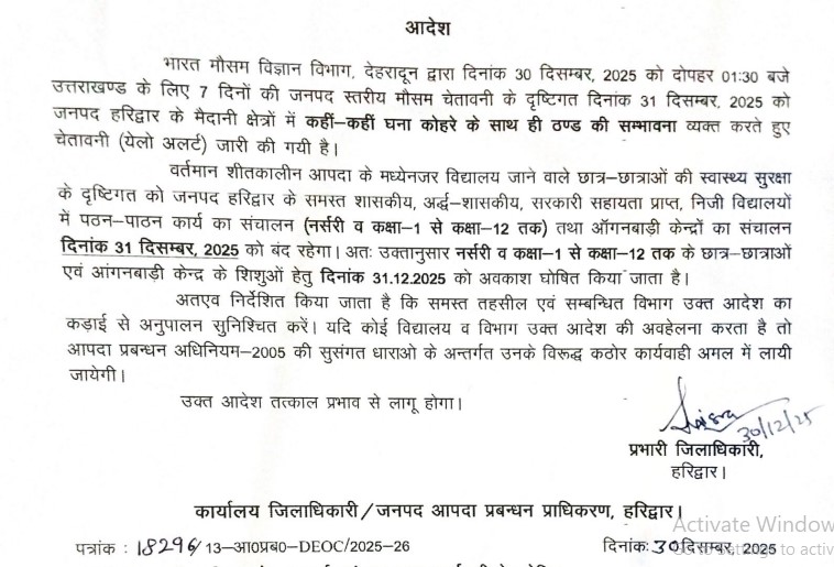 वर्तमान शीतकालीन आपदा की स्थिति और छात्रों की स्वास्थ्य सुरक्षा को ध्यान में रखते हुए जिला प्रशासन ने बड़ा निर्णय लिया है। प्रभारी जिलाधिकारी हरिद्वार ने जारी आदेश के अनुसार जनपद के समस्त शासकीय, अर्द्ध-शासकीय, सरकारी सहायता प्राप्त एवं निजी विद्यालयों में नर्सरी से कक्षा 12 तक की कक्षाएं तथा सभी आंगनबाड़ी केंद्र 31 दिसंबर 2025 को बंद रहेंगे। इस दिन सभी छात्र-छात्राओं और आंगनबाड़ी केंद्रों के शिशुओं के लिए अवकाश घोषित किया गया है।