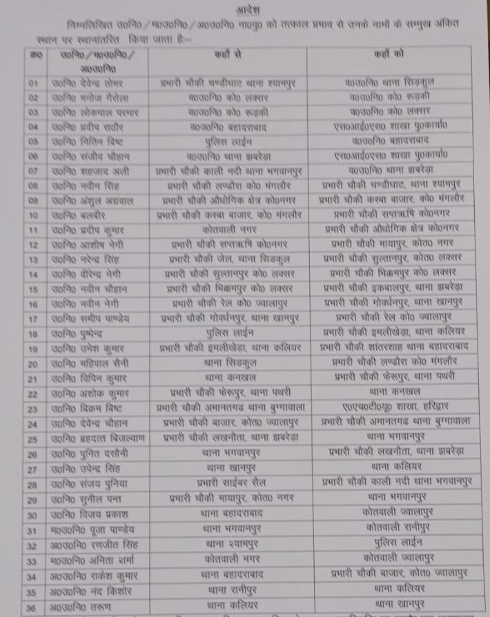 दीपावली से पहले हरिद्वार पुलिस कप्तान ने बड़ी संख्या में उपनिरीक्षकों के तबादले किेये हैं। इनमें चौकी प्रभारी भी शामिल है। तबादला सूची में शामिल उप निरीक्षकों को तत्काल प्रभाव से नवीन तैनाती स्थल पर ज्वाइनिंग करने के निर्देश दिये गए हैं। बताया जा रहा है कि त्योहारी सीजन में कानून व्यवस्था और अधिक बेहतर बनाए जाने के उद्देश्य से ये तबादले किये गए हैं।