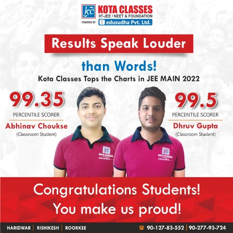हरिद्वार। जेईई मेन 2022 सेशन-2 की जुलाई माह में आयोजित परीक्षा का रिजल्ट सोमवार को वेबसाइट पर आने के बाद कोटा क्लासेस की एडमिन टीम ने छात्र-छात्राओं को फोन पर सम्पर्क कर उनको उनका रिजल्ट बताया। रिजल्ट सुनकर छात्र-छात्राओं में उत्साह की लहर दौड़ पड़ी।