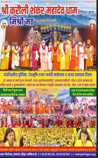 मिश्री मठ, हरिद्वार में चल रहे पंचदिवसीय पूर्णिमा महोत्सव के समापन दिवस पर भक्ति, साधना, योग एवं आध्यात्मिक ऊर्जा का अद्भुत संगम देखने को मिला। इस अवसर पर आवाह्न अखाड़ा के पूर्व राष्ट्रीय सचिव पूज्य शिवशंकर गिरी का पूर्ण गुरु श्री करौली शंकर महादेव ने ससम्मान स्वागत एवं अभिनंदन किया।