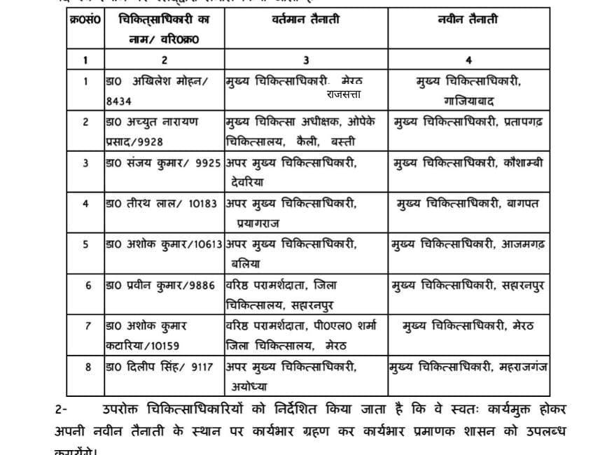 डॉ तीरथ लाल को बागपत का नया सीएमओ बनाया गया है। डॉ अशोक कुमार सीएमओ आजमगढ़ बनाए गए हैं। डॉ प्रवीण कुमार को सहारनपुर के नए सीएमओ की जिम्मेदारी सौंपी गई है। डॉ अशोक कटारिया को सीएमओ मेरठ की जिम्मेदारी दी गई है। वह अभी तक मेरठ के पीएल शर्मा जिला अस्पताल में वरिष्ठ परामर्शदाता के पद पर तैनात थे।