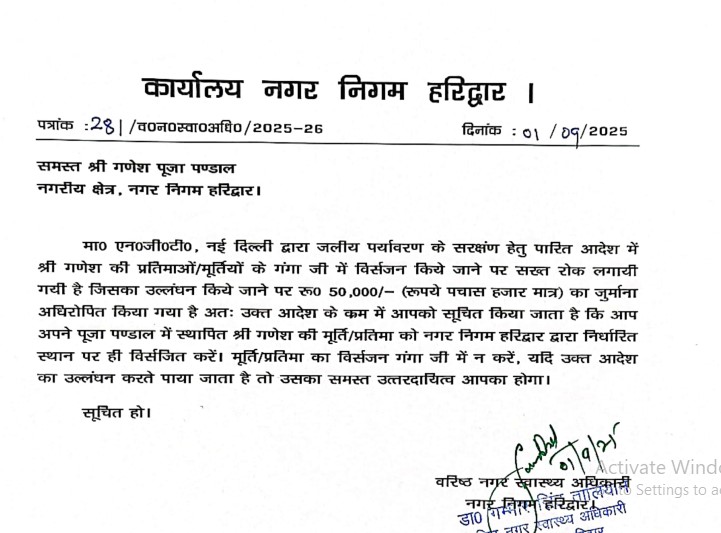 हरिद्वार नगर निगम गंगा को प्रदूषित होने से बचाने के लिए एनजीटी के दिशा निर्देशों का पालन कर रहा है। इस समय गणेश उत्सव चल रहे हैं। श्रद्धालु अपने अपने गणेश की मूर्ति को विसर्जन करने के लिए गंगा के तट पर पहुंच रहे हैं। लेकिन मूर्ति विसर्जन यदि चयनित स्थान पर नहीं किया तो 50 हजार का जुर्माना लग सकता है।