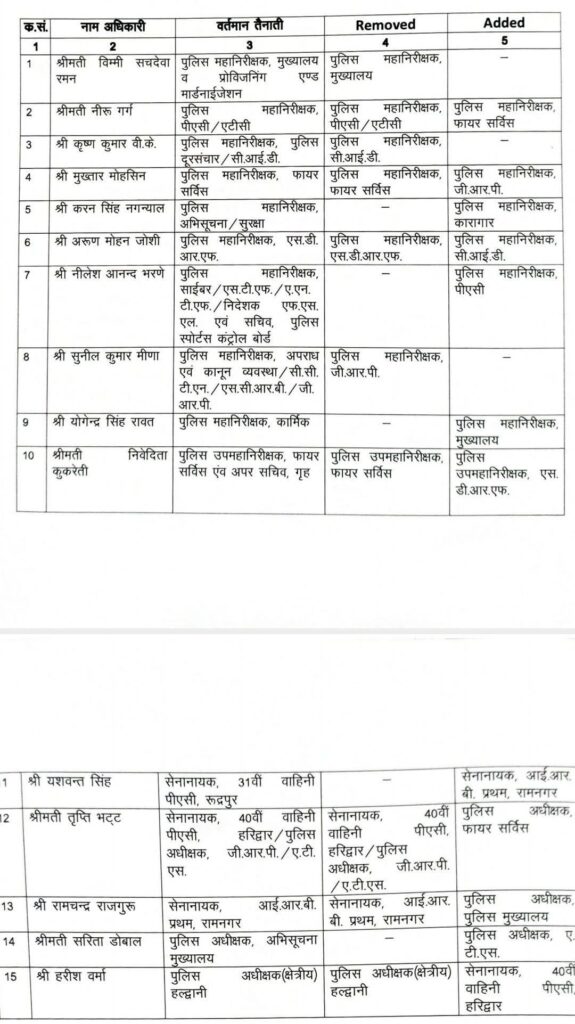 उत्तराखंड में 15 वरिष्ठ आईपीएस अधिकारियों के विभागों में फेरबदल