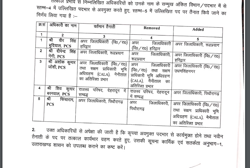 नवीन चौहान. शासन ने हरिद्वार में तैनात अपर जिलाधिकारी वित्त एवं राजस्व वीर सिंह बुदियाल का तबादला कर दिया है। अब उन्हें नई तैनाती अपर जिलाधिकारी रुद्रप्रयाग के पद पर दी गई है। इनके अलावा चार और अधिकारियों के तबादले शासन ने किये हैं। देखें सूची किसे कहां मिली नई तैनाती:—