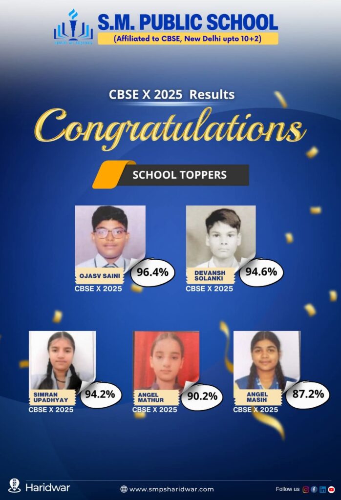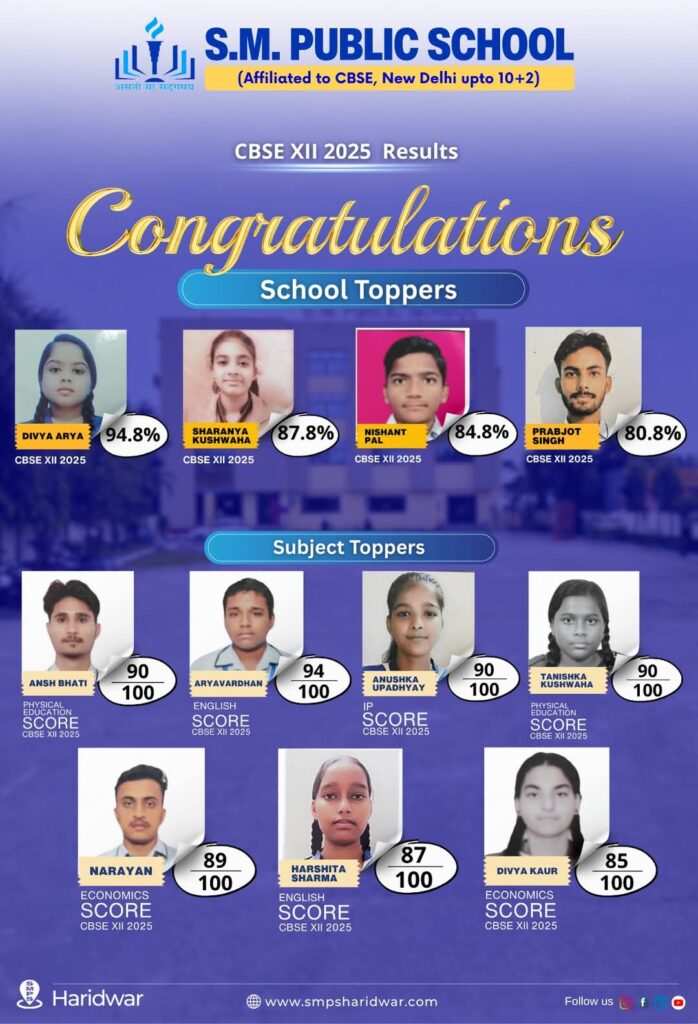 एस.एम.पब्लिक स्कूल ने बोर्ड परीक्षा में एक बार फिर से शैक्षणिक उत्कृष्टता की परंपरा को आगे बढ़ाते हुए CBSE बोर्ड परीक्षा 2024–25 में कक्षा 10वीं और 12वीं में शानदार प्रदर्शन किया है। विशेष उल्लेखनीय बात यह रही कि कक्षा 10वीं का परिणाम 100% रहा, जिसने पूरे विद्यालय परिवार को गौरवान्वित कर दिया।