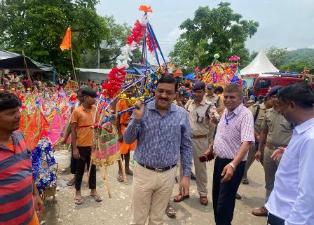 जिलाधिकारी डॉ विनय शंकर पाण्डेय ने गुरूवार को कांवड मेला क्षेत्र का निरीक्षण करते हुए सभी व्यवस्थाओं का जायजा लिया। इस दौरान उन्होंने कांवड बनाने वालों से भी बात की। कांवड की सुंदरता देख वह खुद भी उनके प्रति आकर्षित हो गए और एक कांवड को उन्होंने कांधे पर उठा लिया। एसडीएम पूरन सिंह राणा ने जब कांवड कांधे पर रखी तो शिवभक्तों ने उनके साथ सेल्फी ली।