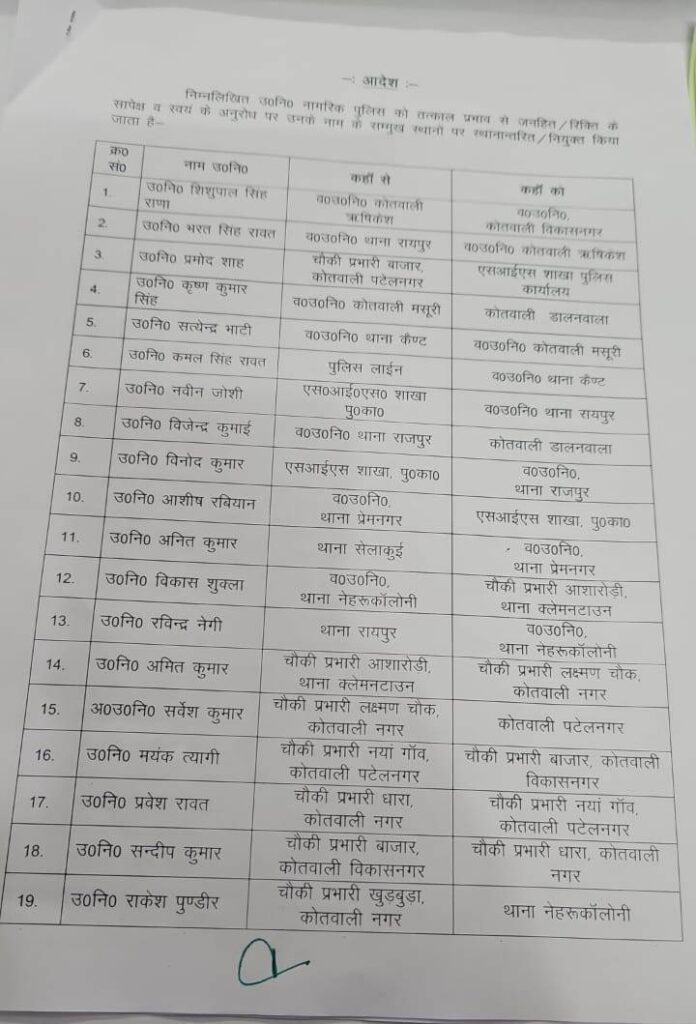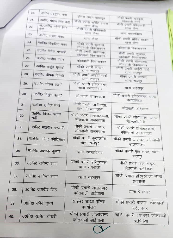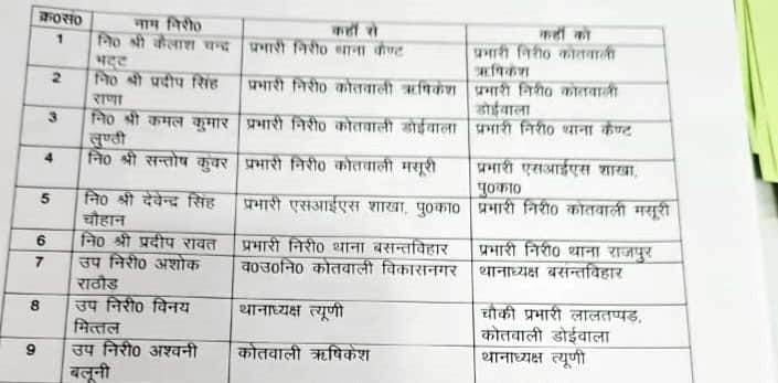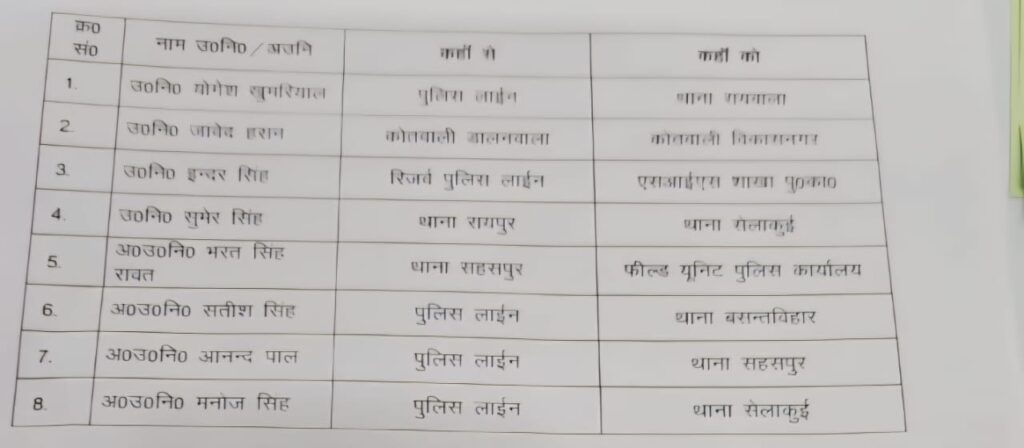 वरिष्ठ पुलिस अधीक्षक अजय सिंह ने शहर में कानून व्यवस्था को और अधिक प्रभावी बनाने के उद्देश्य से बड़े पैमाने पर स्थानांतरण किए हैं। एसएसपी अजय सिंह के निर्देशन में देहरादून पुलिस विभाग में कई निरीक्षकों और उप निरीक्षकों के तबादले किए गए हैं। इस बदलाव का उद्देश्य न केवल प्रशासनिक कुशलता बढ़ाना है, बल्कि जिले में सुरक्षा और शांति बनाए रखना भी बताया गया है।