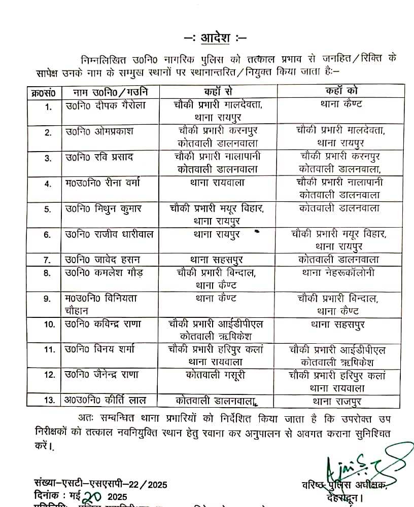एसएसपी देहरादून अजय सिंह ने 13 उप निरीक्षकों के तबादले किये हैं। इनमें सात चौकी प्रभारी भी शामिल हैं। तबादला सूची में शामिल तीन चौकी प्रभारी हटाए गए हैं उन्हें फिलहाल किसी चौकी का प्रभार नहीं दिया गया है।