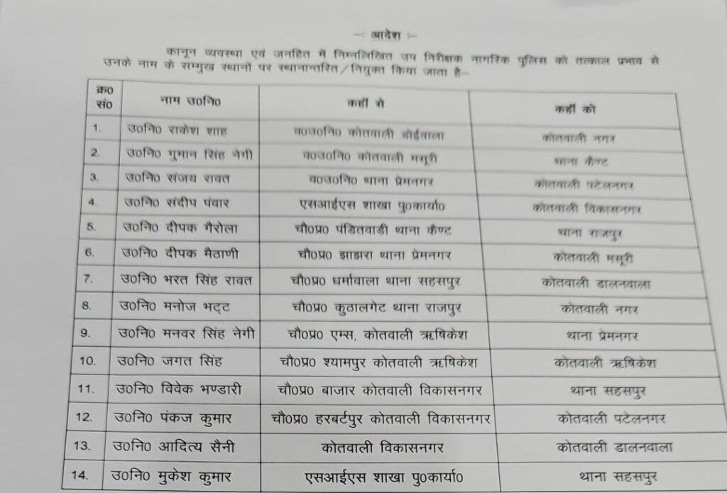 उपनिरीक्षक दर्शन काला को एसएसपी देहरादून अजय सिंह ने दोहरी जिम्मेदारी दी है। दर्शन काला को चौकी प्रभारी श्यामपुर, कोतवाली ऋषिकेश के साथ प्रभारी एसओजी ग्रामीण का प्रभार भी दिया है। एसएसपी ने बड़ी संख्या में उपनिरीक्षकों के तबादले किये हैं। देखें सूची:—