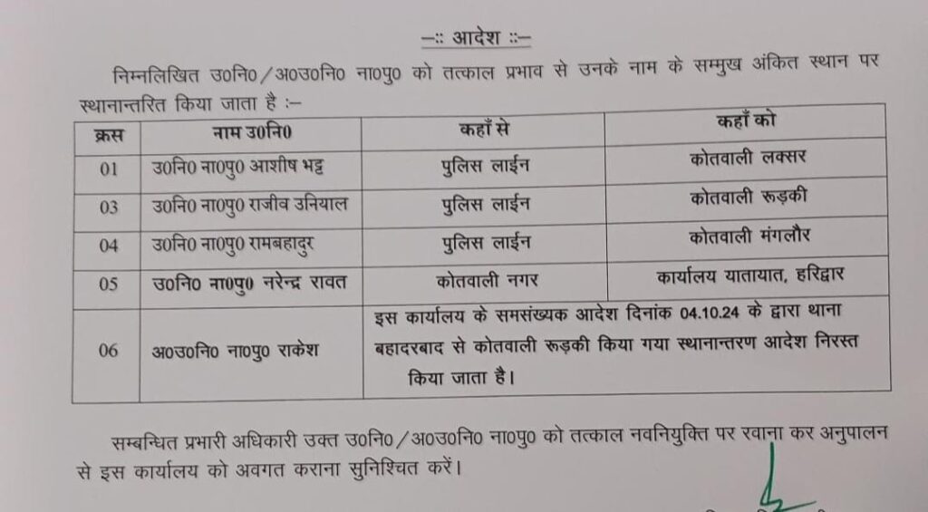 उप निरीक्षक आशीष भट्ट को पुलिस लाइन से कोतवाली लक्सर भेजा गया है। उप निरीक्षक राजीव उनियाल को पुलिस लाइन से कोतवाली रूड़की भेजा गया है। उप निरीक्षक राम बहादुर को पुलिस लाइन से कोतवाली मंगलौर भेजा गया है। उप निरीक्षक नरेंद्र रावत को कोतवाली नगर से कार्यालय यातायात हरिद्वार भेजा गया है। एएसआई राकेश का 4 अक्तूबर को तबादला बहादराबाद से कोतवाली रूड़की किया गया था। इस तबादला आदेश को निरस्त किया गया है।