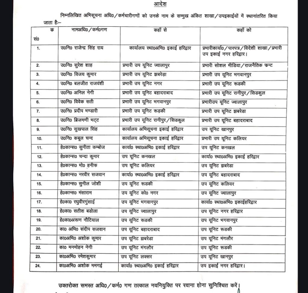 आदेशानुसार एसआई राजेन्द्र सिंह राय को प्रभारी कार्यालय, विदेशी शाखा और उप इकाई नगर हरिद्वार बनाया है। एसआई सुरेश शाह को प्रभारी सोशल मीडिया/राजनैतिक फन्ट का दायित्व सौंपा गया है। उ0नि0 विजय कुमार को उप यूनिट झबरेड़ा से भगवानपुर, उ0नि0 बलजीत राजवंशी को नगर से रुड़की, उ0नि0 अनिल नेगी को बहादराबाद से रानीपुर/सिडकुल तथा उ0नि0 विवेक सती को भगवानपुर से ज्वालापुर स्थानांतरित किया गया है। इसके अतिरिक्त उ0नि0 प्रदीप भण्डारी को रुड़की से झबरेड़ा और उ0नि0 ब्रिजमणी भट्ट को रानीपुर/सिडकुल से बहादराबाद भेजा गया है।