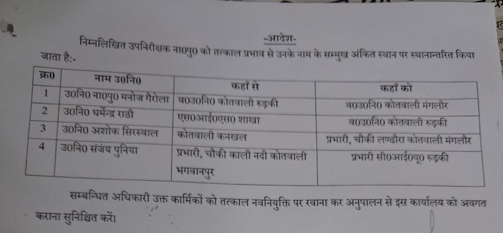 एसएसपी प्रमेंद्र सिंह डोबाल ने किये उपनिरीक्षकों के तबादले February 12, 2026February 12, 2026 naveen chauhan Listen to this article न्यूज 127.एसएसपी प्रमेंद्र सिंह डोबाल ने चार उपनिरीक्षकों के तबादले किये हैं। जिन उप निरीक्षकों के तबादले किये गए हैं उन्हे तत्काल प्रभाव से अपनी नई तैनाती स्थल पर तैनात किये जाने के आदेश दिये गए हैं। देखें सूची:—