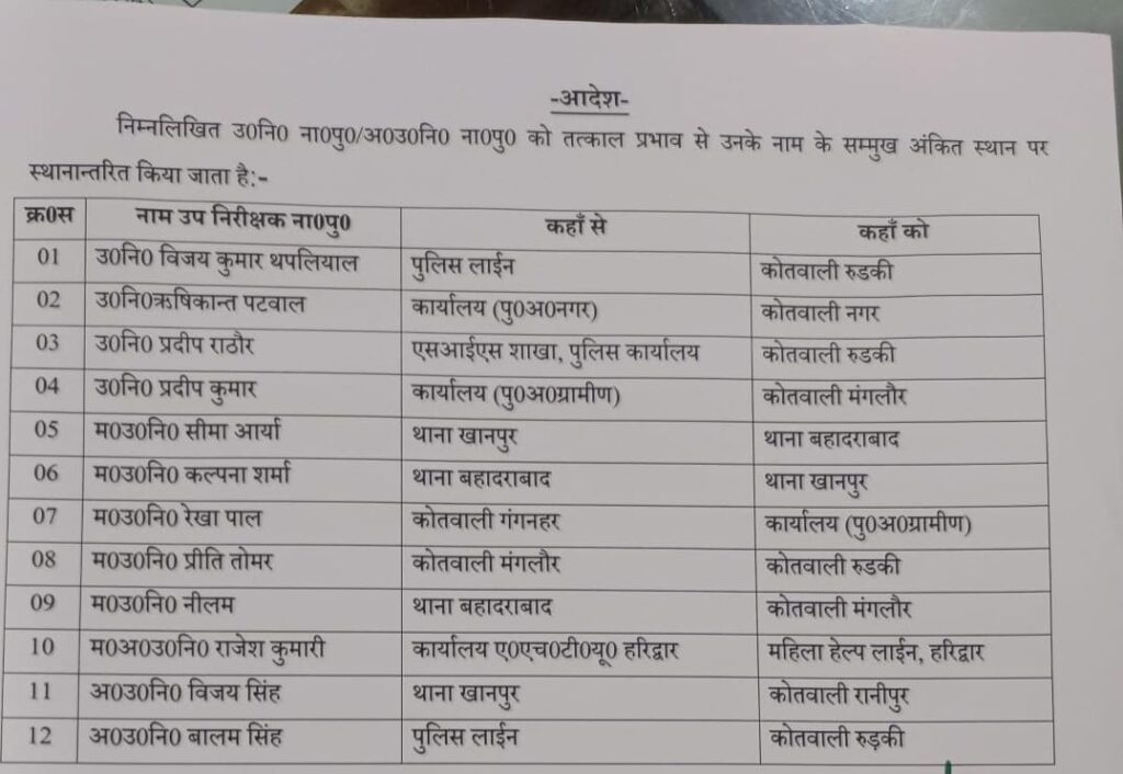 SSP प्रमेंद्र सिंह डोबाल ने किये 12 उप निरीक्षकों के तबादले March 25, 2025March 25, 2025 naveen chauhan Listen to this article न्यूज 127.हरिद्वार के एसएसपी प्रमेंद्र सिंह डोबाल ने देर शाम कई उपनिरीक्षकों के तबादले किये हैं। इनमें महिला उप निरीक्षक भी शामिल हैं, देखे सूची किसे कहां मिली नई तैनाती।
