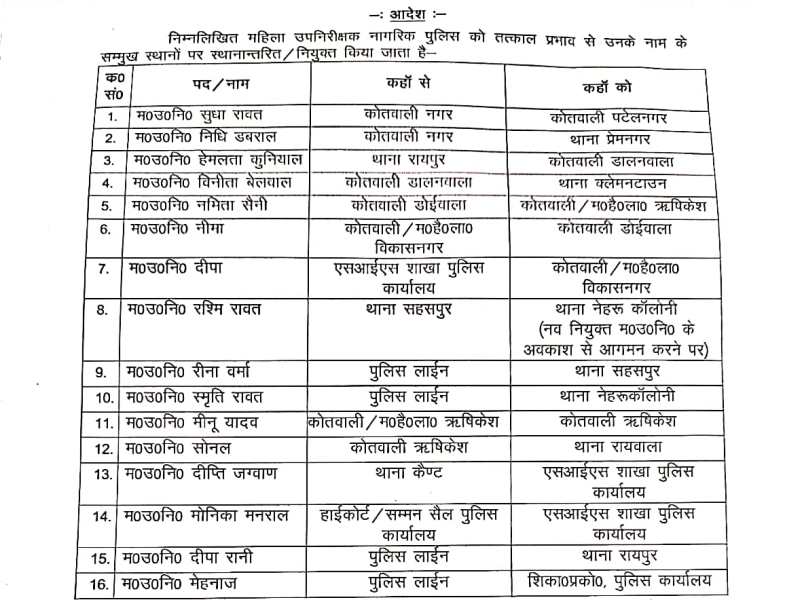SSP ने किये 16 महिला उप निरीक्षकों के तबादले October 11, 2024October 11, 2024 naveen chauhan Listen to this article न्यूज 127.वरिष्ठ पुलिस अधीक्षक देहरादून अजय सिंह ने महिला अधिकारियों के welfare का ध्यान और उनकी समस्या के दृष्टिगत 16 महिला उप निरीक्षक के कार्य क्षेत्र में परिवर्तन करते हुए निम्न स्थानांतरण किए हैं, देखें सूची—