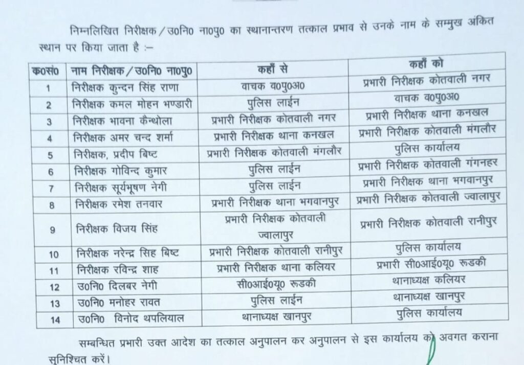 एसएसपी प्रमेंद्र डोबाल ने जनपद में सुरक्षा व्यवस्था और अधिक मजबूत करने के लिए कई थाना प्रभारियों के तबादले किये हैं। इनमें शहर कोतवाली और कनखल कोतवाली प्रभारी भी शामिल हैं।
