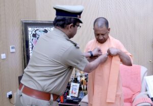CM योगी आदित्यनाथ को अग्निशमन स्मृति दिवस पर लगाया फ्लैग पिन