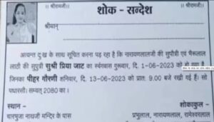 नवीन चौहान.अपनी ही बिरादरी के एक युवक के साथ घर से फरार हुई युवती के परिजनों ने अपनी बेटी को मरा मानते हुए उसकी तेहरवीं के कार्ड छपवाकर रिश्तेदारों में बंटवा दिये। यह मामला राजस्थान […]
