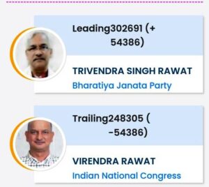 न्यूज 127.हरिद्वाार सीट पर भाजपा प्रत्याशी त्रिवेंद्र सिंह रावत ने कांग्रेस के वीरेंद्र रावत से एक लाख 22 हजार से अधिक वोटों से बढ़त बना ली है। प्रदेश में भाजपा के शुरूआती रूझानों के बाद […]
