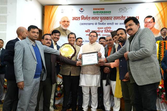 मुख्यमंत्री पुष्कर सिंह धामी ने सोमवार को मुख्यमंत्री आवास स्थित मुख्य सेवक सदन में स्वच्छ सर्वेक्षण-2022 में बेहतर प्रदर्शन करने वाले निर्मल नगरों को अटल निर्मल नगर पुरस्कार 2023 से सम्मानित किया। इस अवसर पर प्रदेश के 09 निकायों को अटल निर्मल पुरस्कार एवं राष्ट्रीय स्तर पर पुरस्कृत 05 निकायों को स्वच्छ गौरव सम्मान प्रदान किया गया। मुख्यमंत्री ने कार्यक्रम के दौरान दून कैंट स्वच्छता चौपाल का लोगो लाँच भी किया।