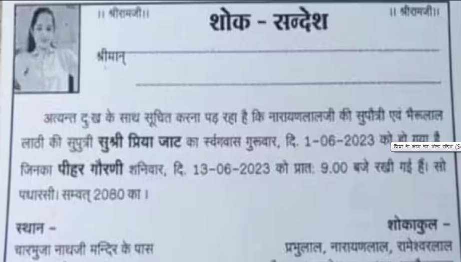 सोशल मीडिया पर भी यह शोक संदेश वायरल हो रहा है। इसमें 1 जून को बेटी की मौत हो जाने और 13 दिन बाद यानि 13 जून को गोरनी (मृत्यु भोज) में शामिल होने के लिए लोगों को बुलाया गया है। सोशल मीडिया पर वायरल हो रहे कार्ड पर लड़की की तस्वीर छपी हुई है।