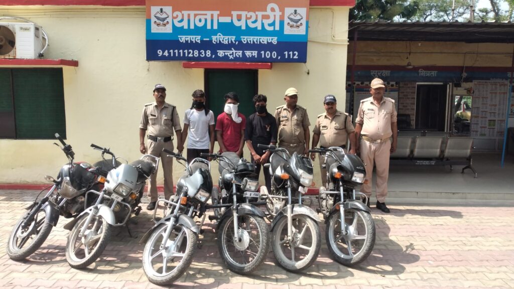 थाना पथरी पुलिस के मुताबिक अमरीश कुमार निवासी धारी वाला ने अपनी मोटरसाइकिल चोरी होने के संबंध में दो दिन पहले रिपोर्ट दर्ज करायी थी। पुलिस चोरी के वाहन की तलाश के लिए चेकिंग कर रही थी। इसी दौरान पुलिस को तीन संदिग्ध आते दिखायी दिये। पुलिस ने उन्हें रोककर पूछताछ की तो उन्होंने अपनी निशानदेही पर अलग अलग स्थानों से चोरी की गई 6 मोटरसाइकिल बरामद करायी। गिरफ्तार अभियुक्तों के नाम अमित, शुभम और ऋतिक हैं। पूछताछ में तीनों ने पुलिस को बताया कि वह कम पढ़े लिखे है और नशे की लत को पूरी करने के लिए वाहन चोरी की घटनाओं को अंजाम देते हैं।